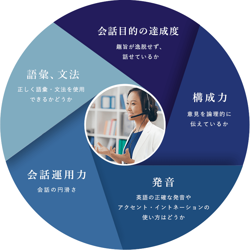 プライムトークは受講生がマンツーマンで、受け身ではなく、受講生がリーダーシップをもって、話せることを中心にしたコミュニカティブメソッドを採用しております。単に話すのではなく、図の5つの基準で英語力を伸ばせるように、プログラムを組んでいます。